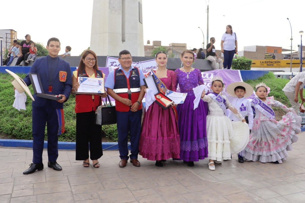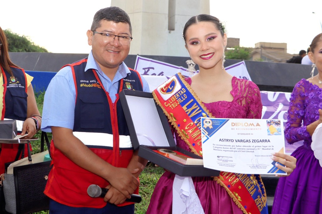 Uno de los momentos más emotivos del evento fue el reconocimiento a los campeones de la categoría Junior del 65° Concurso Nacional y 15° Mundial de Marinera, Mauricio Cárdenas Campos y Astryd Vargas Zegarra. El gerente de Desarrollo Social, Lic. Anthony Vega, en representación del alcalde provincial Fernando Cárdenas, hizo entrega de este merecido reconocimiento a los jóvenes bailarines.
