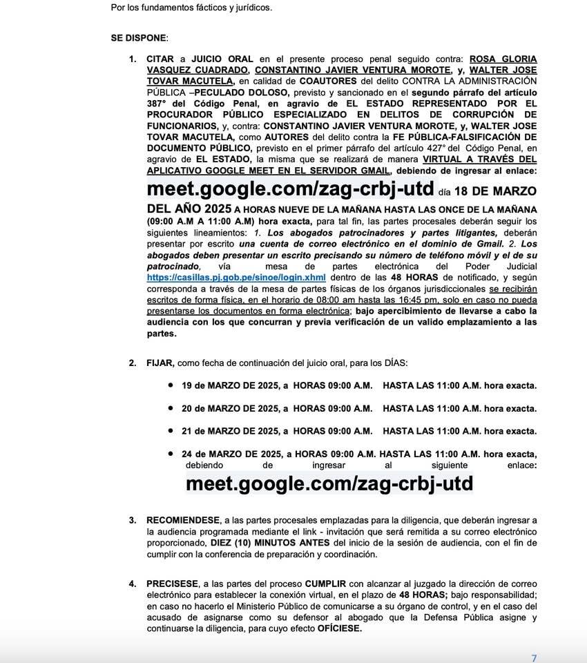 Según la Resolución del 20 de enero de 2025 del Segundo Juzgado de Investigación Preparatoria de Crimen Organizado y Corrupción de Funcionarios de la Molina, el expediente fue transferido al Juzgado Penal Colegiado Transitorio SEDE NCPP ATE, que están citando a Juicio Oral a ROSA VÁSQUEZ CUADRADO en calidad de coautora del delito de Administración Pública, PECULADO DOLOSO, la misma que se realizará el 18 de marzo de 2025 a horas 9 am. a 11 am, con fechas de continuación del JUICIO ORAL los días 19, 20, 21, y 24 de marzo de 2025, de 9.00 a.m. a 11a.m.