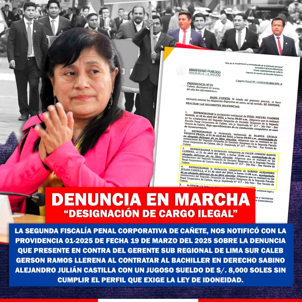 La Segunda Fiscalía Penal Corporativa de Cañete del Segundo Despacho de decisión temprana encargada por la fiscal Ana Guísela López Govea, nos notificó con la providencia 01-2025 de fecha 19 de marzo del 2025 sobre la denuncia que presente en contra del gerente Subregional de Lima Sur Caleb Gerson Ramos Llerena al contratar al bachiller en derecho Sabino Alejandro Julián Castilla por el ilícito penal de nombramiento y aceptación ilegal de cargo, es de recordar que mediante Resolución Gerencial Sub Regional de Lima Sur n° 002-2023-GRL-Lima Sur el licenciado Caleb Gerson Ramos Llerena designó como jefe de la oficina de Administración de la Unidad Ejecutora de Lima Sur del Gobierno Regional de Lima, que según el clasificador de cargo de la misma entidad, determina que para este puesto se requiere como mínimo 5 años en el ejercicio profesional y 3 años en funciones similares entre otros requisitos.