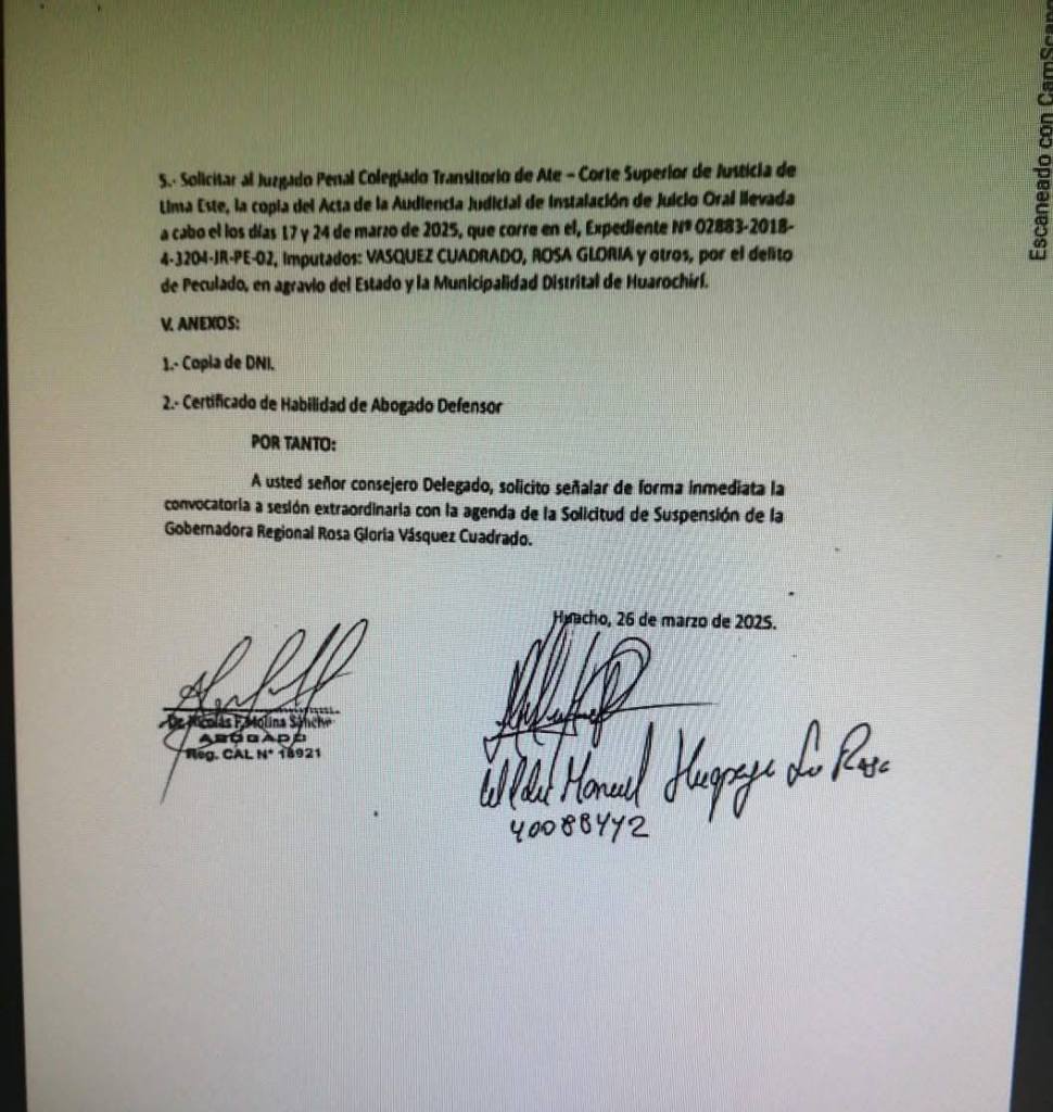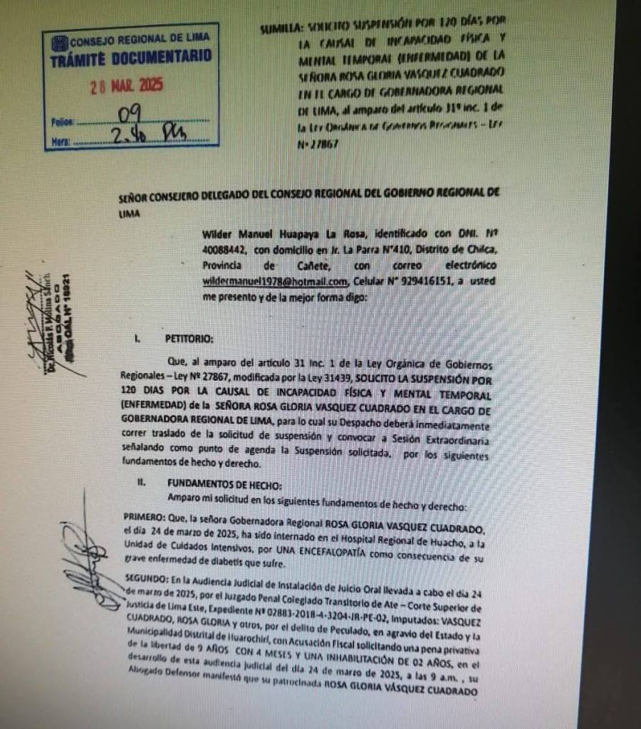 Ciudadano Wilder Manuel Huapaya La Rosa, solicitó este 28 de marzo la suspensión por 120 días de la gobernadora Rosa Vásquez Cuadrado a raíz de su internamiento a UCI del Hospital Regional de Huacho por una encelopatía debido a la diabetes.