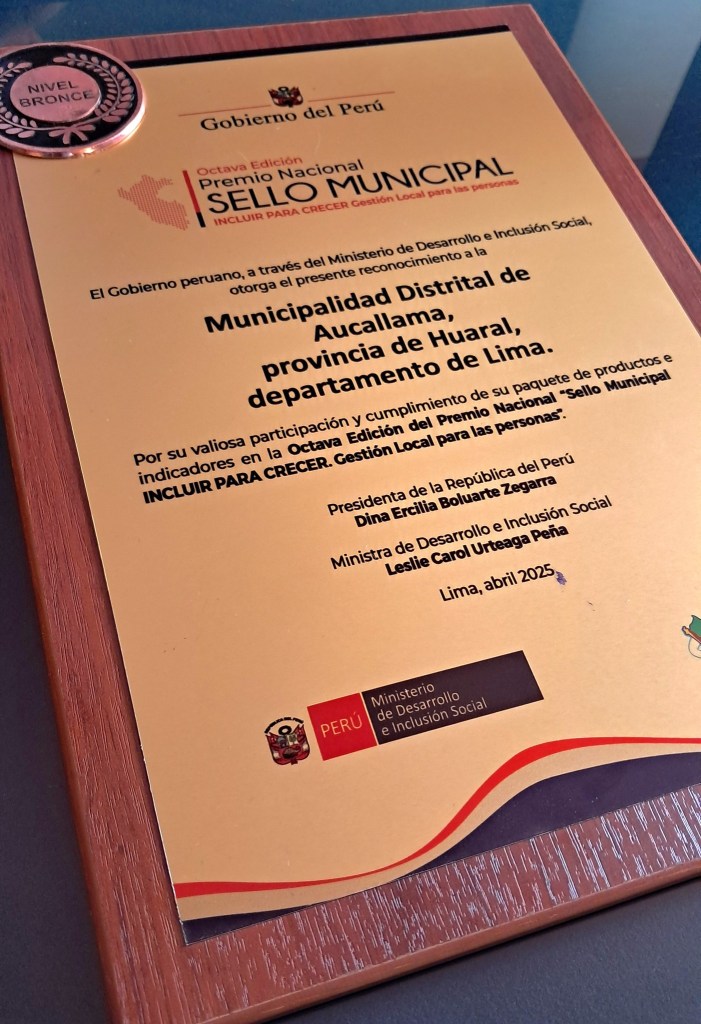 La gestión que lidera el alcalde de Aucallama, Edwin Valdivia Santiago, obtuvo un nuevo logro tras recibir el Premio Nacional Sello Municipal: Incluir para Crecer – Gestión Local para las Personas 2024, auspiciado por el Gobierno del Perú, mediante el Ministerio de Desarrollo e Inclusión Social -MIDIS.