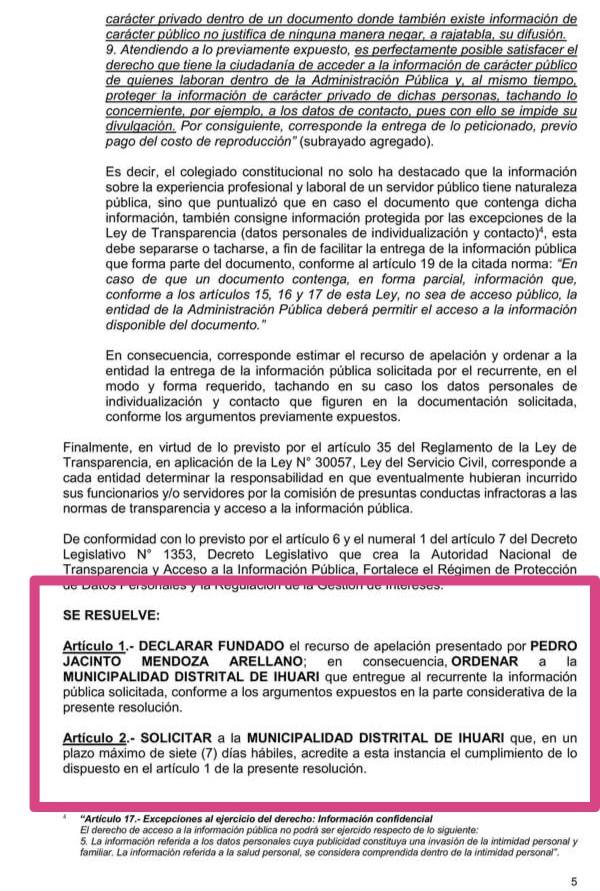 Artículo 1.- DECLARAR FUNDADO el recurso de apelación presentado por PEDRO JACINTO MENDOZA ARELLANO; en consecuencia, ORDENAR a la MUNICIPALIDAD DISTRITAL DE IHUARI que entregue al recurrente la información pública solicitada, conforme a los argumentos expuestos en la parte considerativa de la presente resolución.