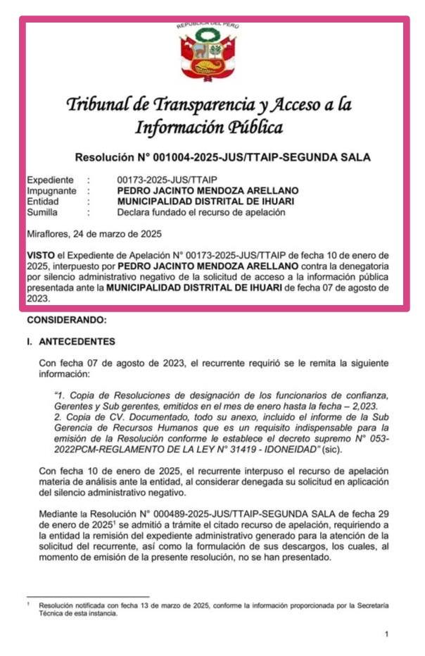 El Tribunal de Transparencia da la razón al coordinador de Fredelco-Huaral el alcalde de Ihuarí debería entregar los documentos en un plazo de 7 días de acuerdo a la resolución emitido el día de hoy.