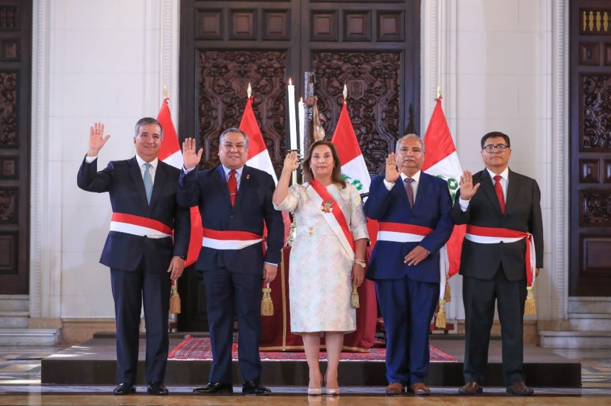La presidenta Dina Ercilia Boluarte Zegarra tomó juramento a Raúl Pérez Reyes, Carlos Malaver Odias y César Sandoval Pozo, como nuevos ministros de Economía y Finanzas, del Interior, y de Transportes y Comunicaciones, respectivamente.
