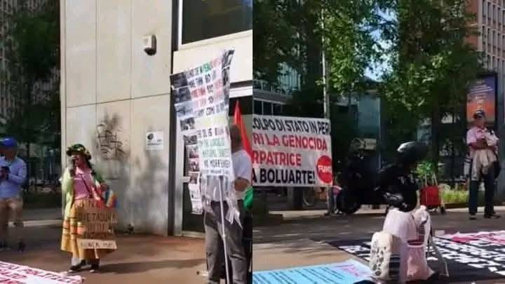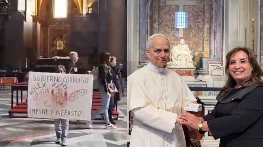 «Diez ciudadanos peruanos fueron interceptados por personal de seguridad cuando intentaban llegar a la zona de la plaza de San Pedro portando carteles y otras pancartas con mensajes de protesta contra las autoridades gubernamentales» de Perú, informó la Jefatura de Policía de Roma.