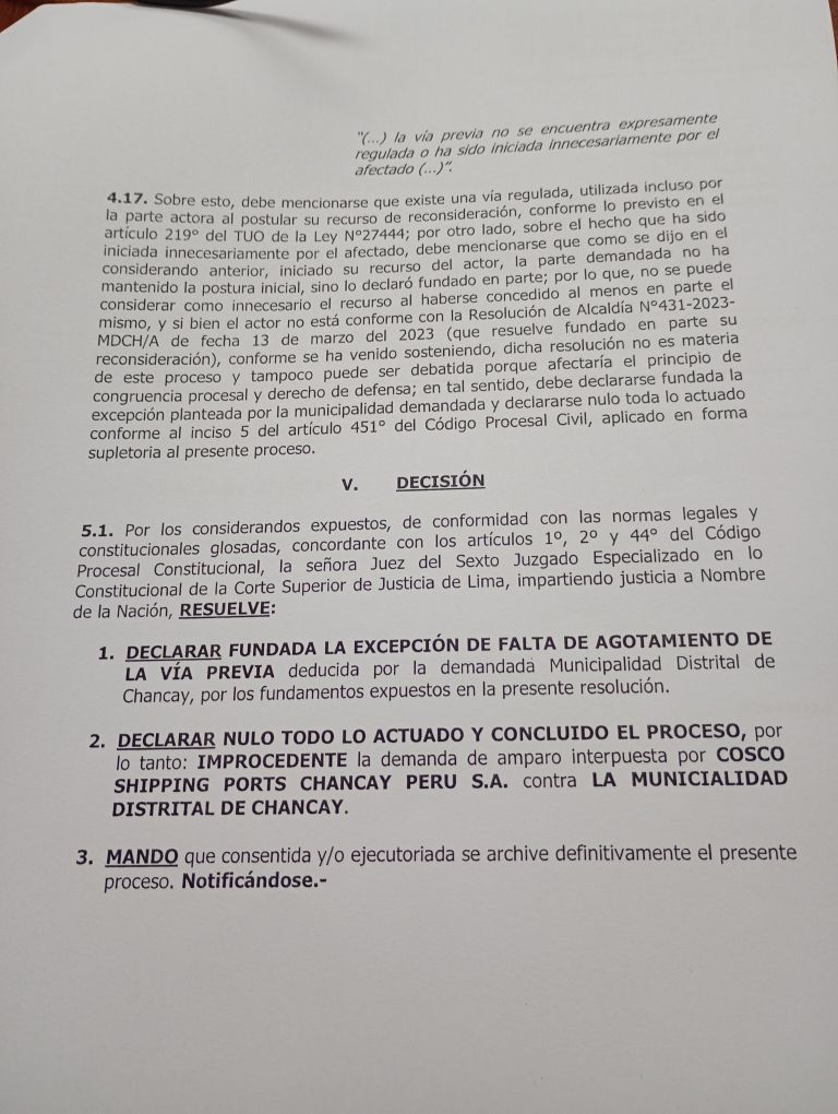 Como ustedes recordarán la empresa COSCO SHIPPING PORTS CHANCAY PERÚ S.A  a través del Estudio Jurídico  Echecopar de Lima, demandó a la Municipalidad Distrital de Chancay ante el Sexto Juzgado Constitucional de Lima -Sede Alzamora, vía proceso constitucional de amparo, para que se declare  nulo y sin efecto legal alguno el acto administrativo contenido en la Resolución N°335-2022 MDCH/A, resolución que  dispuso revocar la Resolución de Gerencia Municipal N° 082-2022 MDCH/GM que aprobó el plan de Contingencia Vial y de Desvío de Tránsito Vehicular y Peatonal para el desarrollo del proyecto Terminal Portuario Multipropósito de Chancay.