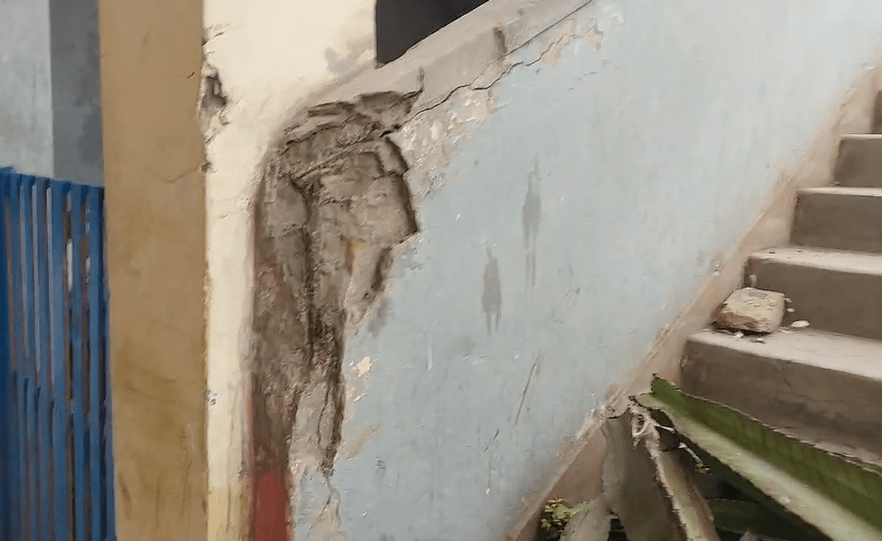 “La ventana se ha inclinado y se siente ruido, parece que se va a caer. En el segundo piso hay una grieta y, por temor, estamos acá afuera”, explica una profesora mientras da clases rodeada de polvo y bajo el sol. Los padres de familia han sido tajantes: “La estructura ya no sirve. Es más seguro que estudien afuera”.