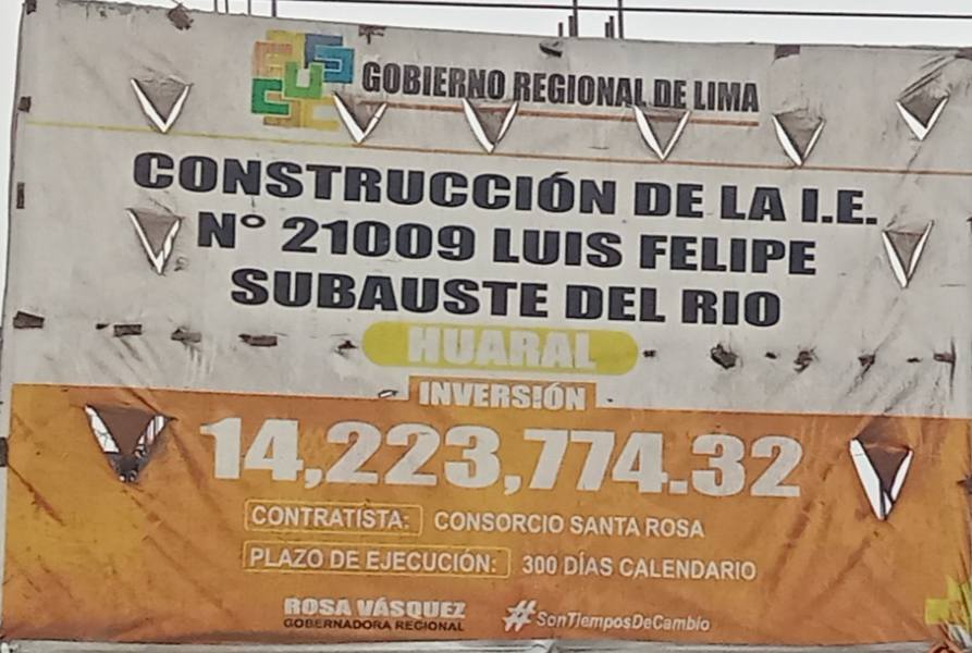 Cuando hace más de un año, la gobernadora regional Rosa Vásquez Cuadrado dió luz verde al inicio de la construcción del nuevo edificio para la histórica Institución Educativa 21009 de Huaral (ex 421), para la alergia y satisfacción de toda la población de Huaral, todos pensamos que sería en el plazo de 300 días como anunciaba el letrero que se colocó en el lugar, y donde además se señalaba el monto de inversión de más de 14 millones de soles. Y se creía que era por la construcción total del edificio, porque el letrero no mencionaba nada diferente.