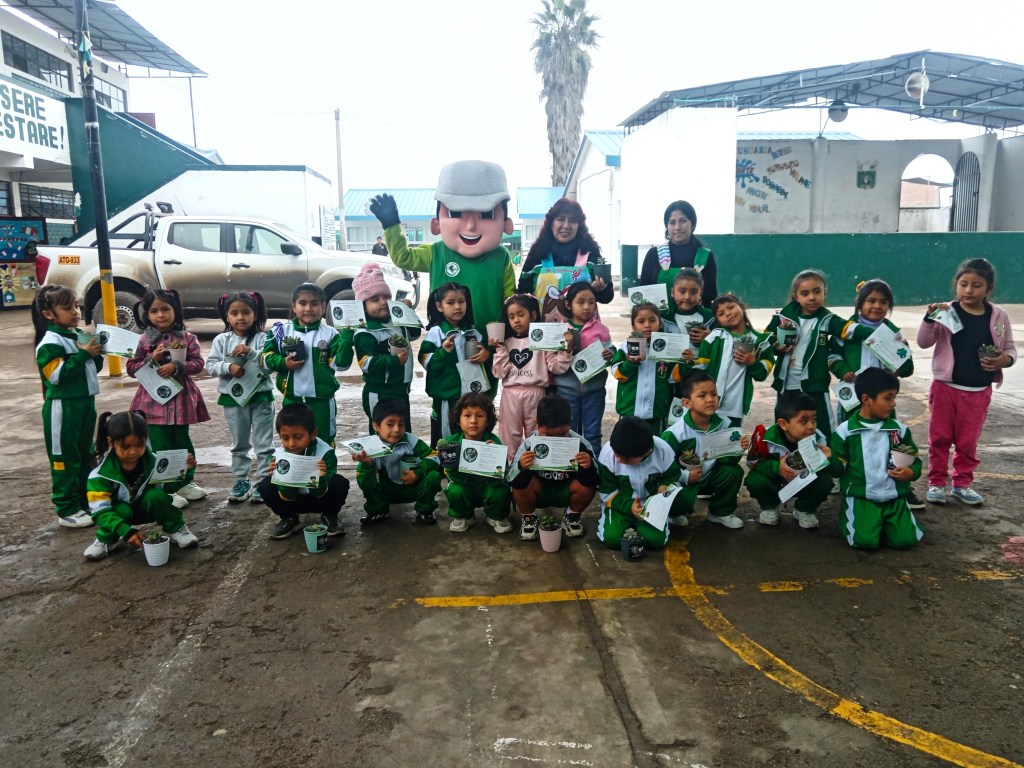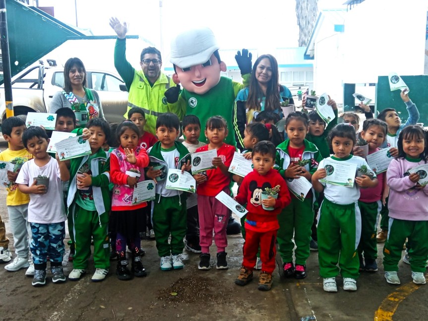 La subdirectora de primaria, Raquel Sánchez, acompañaba la actividad y agradecía a Colquisiri por llevar esta estrategia a sus alumnos. «Nuestros niños se preparan, traen sus botellas para cambiarlas por plantitas», dijo.
