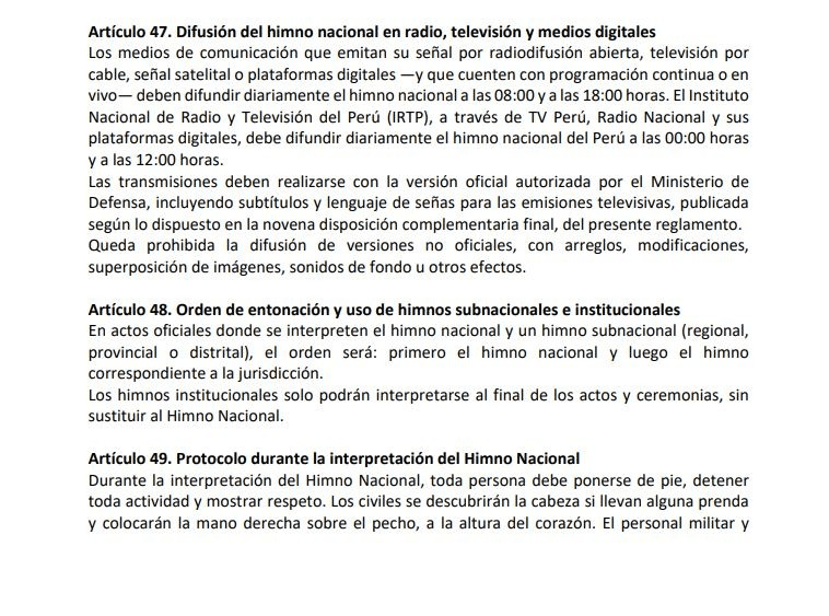 «El Instituto Nacional de Radio y Televisión del Perú (IRTP), a través de TV Perú, Radio Nacional y sus plataformas digitales, debe difundir diariamente el himno nacional del Perú a las 00:00 horas y a las 12:00 horas», añadieron.