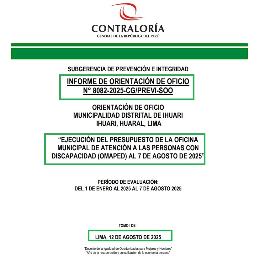 2.-INFORME DE ORIENTACIÓN DE OFICIO N° 8082-2025-CG/PREVI-SOO ,de fecha 12 de agosto del 2025,en donde se precisa que la situación adversa radica en lo siguiente : «LA ENTIDAD (LA MUNICPALIDAD DE IHUARÍ) NO HA EJECUTADO EL PRESUPUESTO ASIGNADO A LAS ACTIVIDADES A CARGO DE SU OMAPED DESTINADAS A LA ATENCIÓN DE LA POBLACIÓN CON DISCAPACIDAD DE SU JURISDICCIÓN,SITUACIÓN QUE PODRÍA AFECTAR LAS ACCIONES ORIENTADAS A GARANTIZAR SUS DERECHOS,EL ACCESO A SERVICIOS ESENCIALES COMO LA ASISTENCIA NECESARIA PARA LA OBTENCIÓN DE LA PENSIÓN DE S/300.00 SOLES OTORGADA POR EL PROGRAMA NACIONAL «CONTIGO».