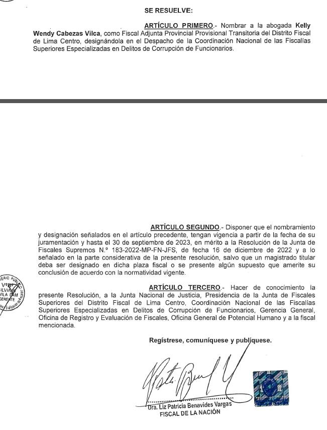 Resulta que esta fiscal no tiene la experiencia necesaria para estar presente en un caso tan delicado. Ella es egresada en el mes de diciembre año 2019 y ya el 13 de junio del 2023, estaba siendo nombrada como Fiscal Adjunta Provisional Transitoria del distrito fiscal de Lima Centro, en el despacho de la Coordinación Nacional de las Fiscalías Superiores Especializadas en Delitos de Corrupción de Funcionarios.