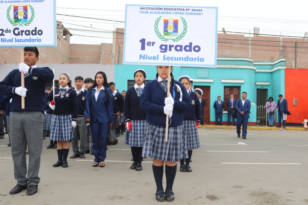 La directora de la Institución Educativa «José Alejandro López Durand» hizo uso de la palabra saludando a la comunidad educativa por su aniversario y expresó su gratitud a la autoridad municipal por las coordinaciones que se vienen realizando para el desarrollo de la comunidad escolar.