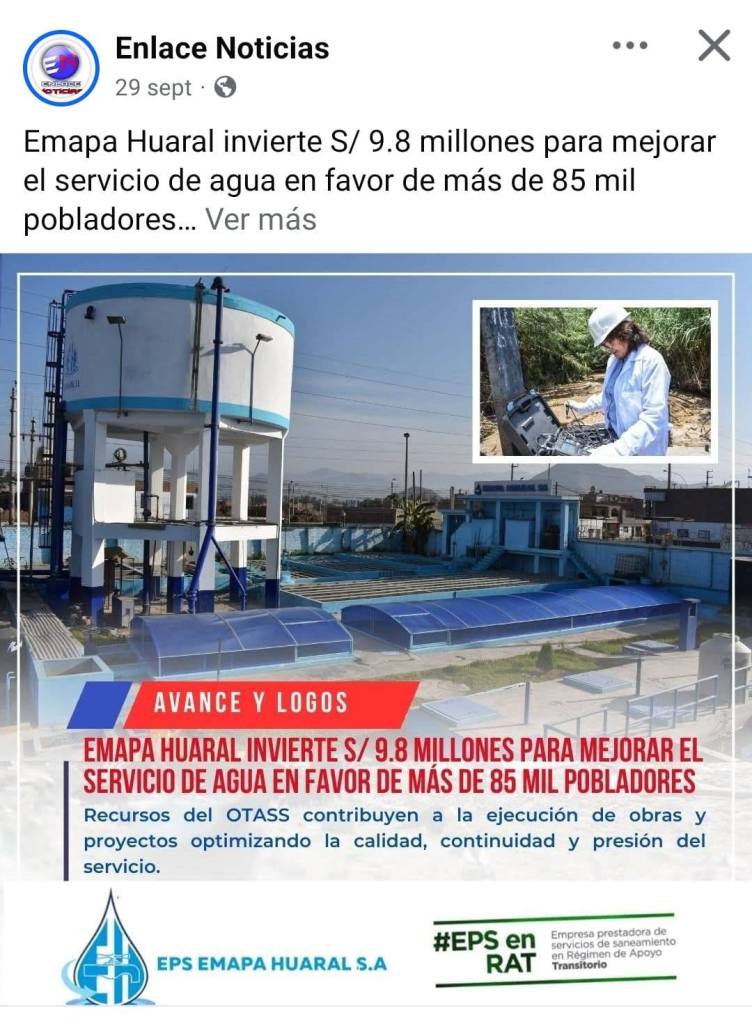 El Organismo Técnico de la Administración de los Servicios de Saneamiento (OTASS) volvió a aparecer en portales nacionales pagados: hablan de S/ 9.8 millones en supuestas inversiones que “mejoraron el servicio” a más de 85 mil pobladores, cuando la realidad grita lo contrario. En Huaral, el agua llega por horas, los recibos suben sin razón y los reclamos se multiplican sin respuesta.