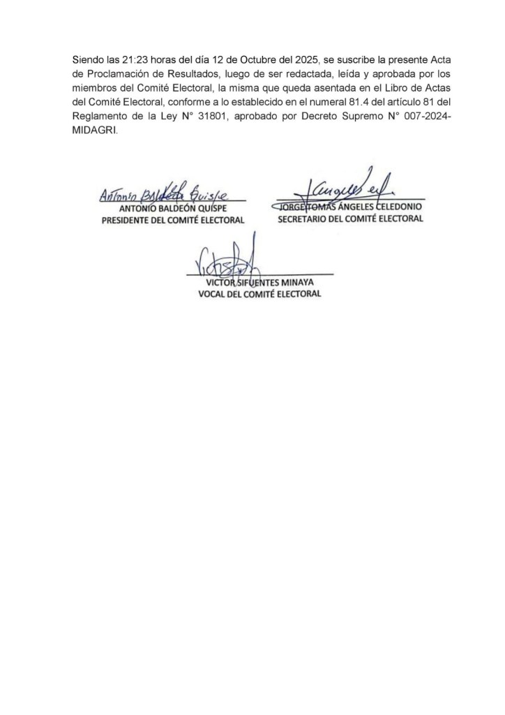En segundo lugar, se ubicó el candidato de la lista Nº 4, Antonio Claros, seguido por la lista Nº 5, liderada por Julio Melgarejo. El cuarto lugar fue para la lista Nº 2, presidida por Filomeno Eustaquio, y finalmente la lista N° 1, encabezada por José Rojas Fernández, ocupó el quinto puesto.