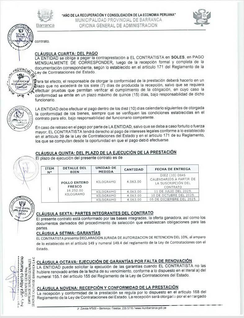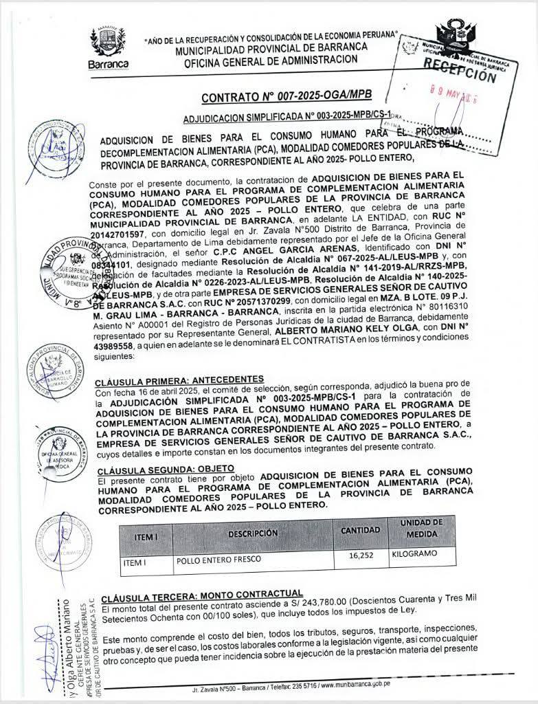 En un hecho que ha despertado la preocupación de toda la provincia de Barranca, la empresa “Señor Cautivo de Barranca” habría obtenido recientemente la adquisición de pollo entero por un monto de S/. 243,780.00 soles, pese a que no cuenta con la autorización sanitaria correspondiente otorgada por la DIGESA, según información revisada en fuentes oficiales.