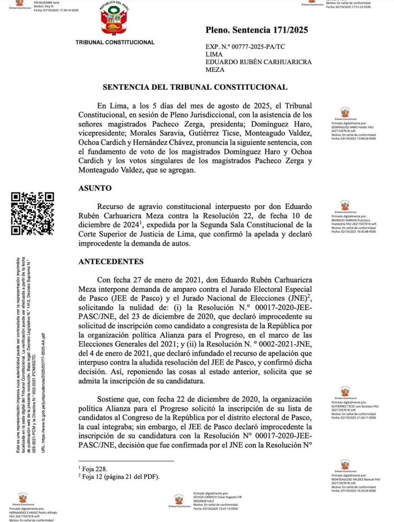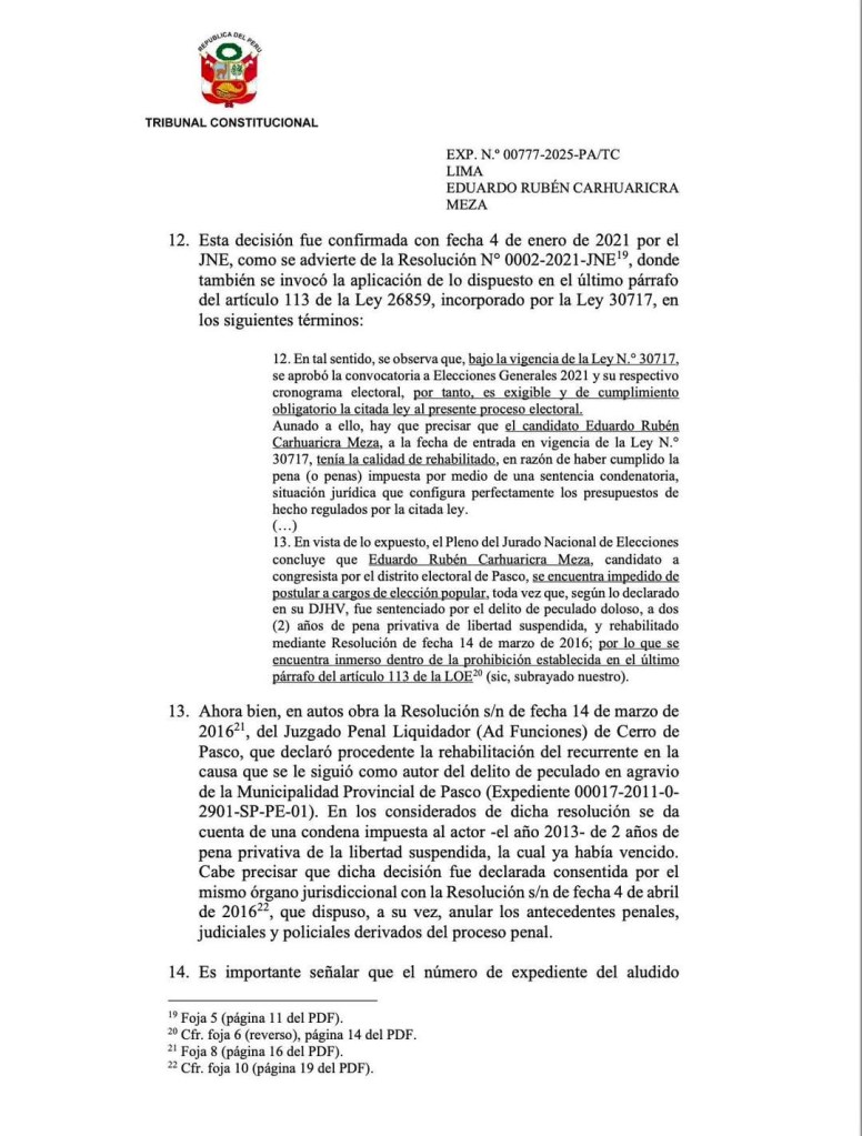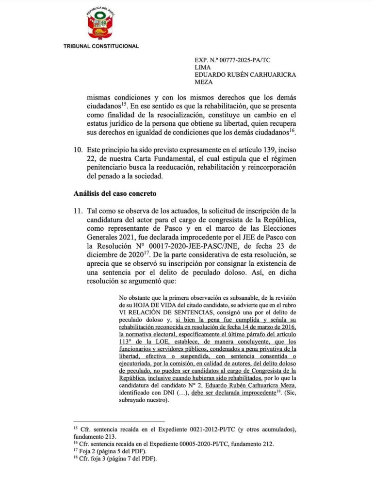 Una nueva controversia sacude el panorama político de Pasco luego de conocerse que Eduardo Carhuaricra, exfuncionario y militante de Alianza para el Progreso, habría sido beneficiado por una reciente decisión del Tribunal Constitucional (TC) que, según diversos especialistas, podría permitir su retorno a la competencia electoral pese a contar con una sentencia condenatoria por peculado doloso, delito considerado dentro del espectro de corrupción de funcionarios.