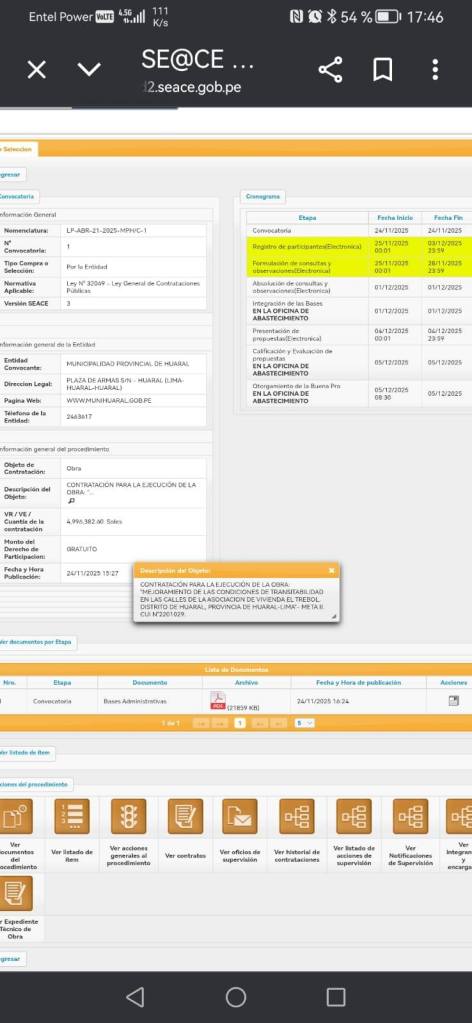Se conoció que ya se encuentra registrada en el sistema del SEACE la licitación pública para la continuación del proyecto denominado: “Mejoramiento de las condiciones de transitabilidad en las calles de la Asociación de Vivienda El Trébol, distrito de Huaral, provincia de Huaral, Lima – Meta II”, con CUI N.° 2201029.