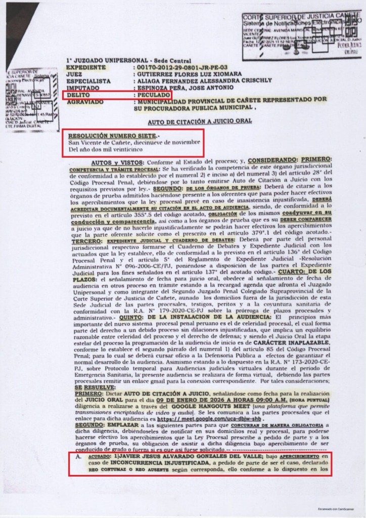 Los hechos son claros y documentados. Según notificación oficial del Poder Judicial, la Corte Superior de Justicia de Cañete ha programado una audiencia de juicio oral inaplazable para el 9 de enero de 2026, a las 9:00 a. m.