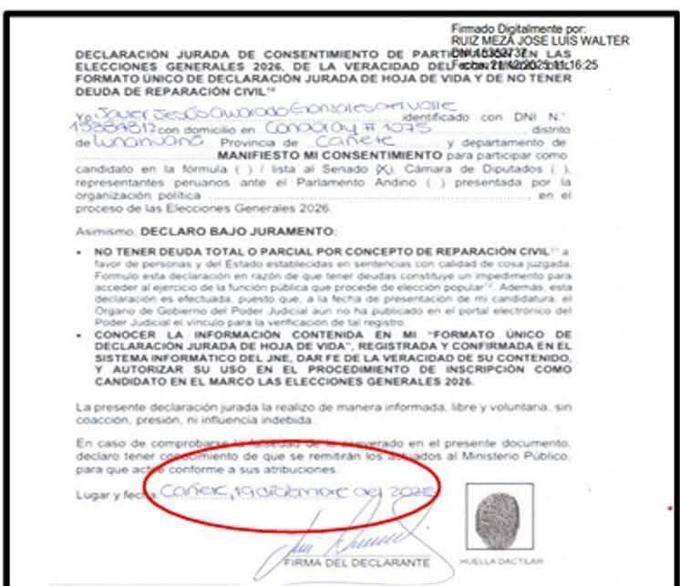En tal sentido, lo advertido, estaría incumpliendo lo previsto en el artículo 33 del Reglamento, en su numeral 33.6 último párrafo que dispone: …(..) “la declaración jurada a que se refiere el párrafo anterior debe contar con la huella dactilar y firma de cada candidato en fecha igual o posterior a la confirmación del registro de información completa de la DJHV en el sistema informático”.