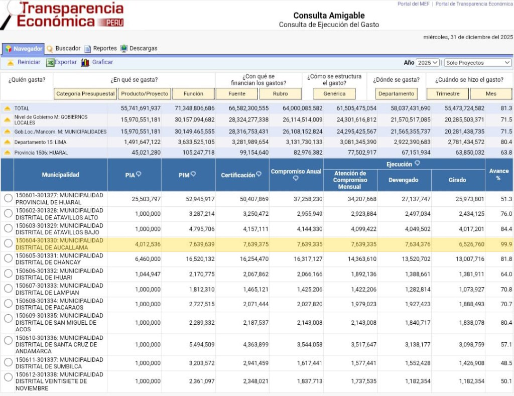 La Municipalidad Distrital de Aucallama alcanzó el primer lugar en ejecución de inversiones durante el año fiscal 2025, al registrar un 99.9 % de avance, lo que equivale en términos prácticos al 100 % del presupuesto destinado a inversiones públicas, según datos del Portal de Transparencia Económica del Ministerio de Economía y Finanzas (MEF).