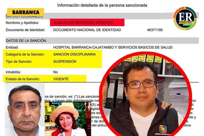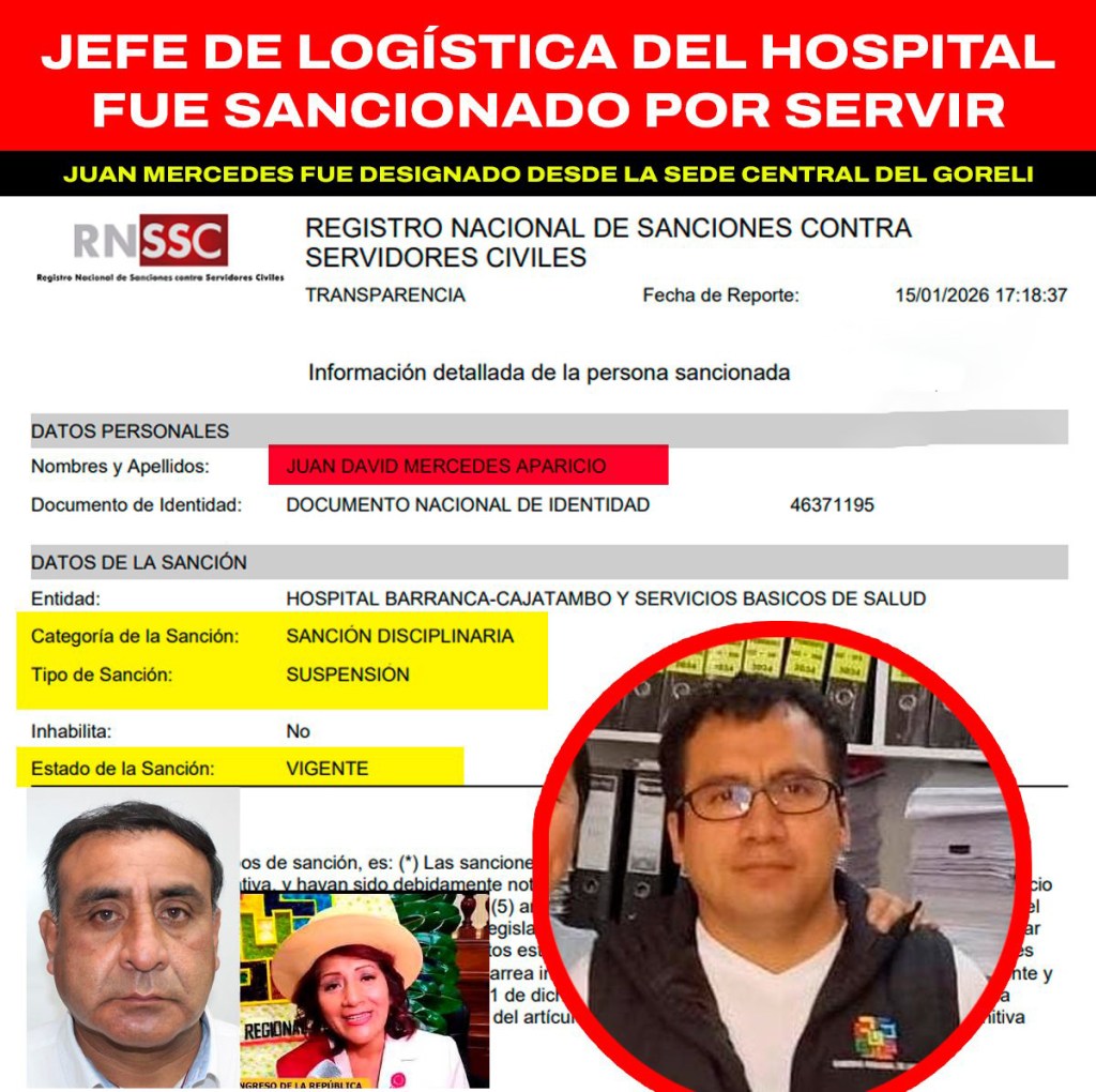 El jefe de la Unidad de Logística del hospital Barranca–Cajatambo, Juan David Mercedes Aparicio, fue sancionado por SERVIR y registra una suspensión vigente en el Registro Nacional de Sanciones, lo que implica que no debería ejercer funciones ni percibir remuneración del Estado mientras dure la medida.