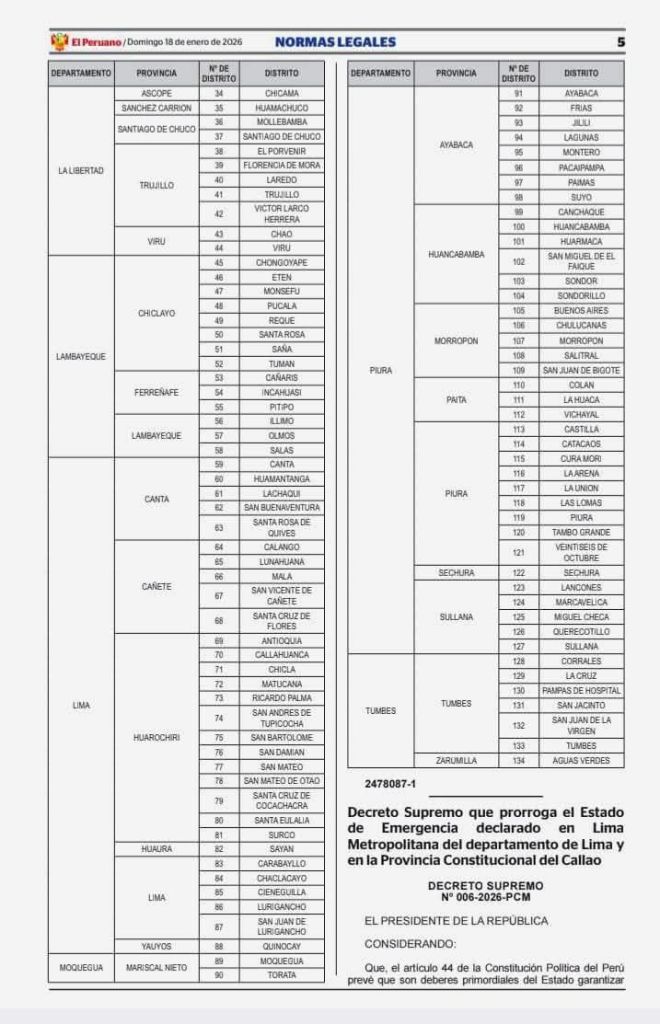 El gobierno nacional declaró este domingo 18 de enero, el Estado de Emergencia en algunos distritos de varias provincias de la Región Lima, por peligro inminente ante intensas precipitaciones pluviales, por el plazo de sesenta (60) días calendario, para la ejecución de medidas y acciones de excepción, inmediatas y necesarias, de reducción del Muy Alto Riesgo existente, así como de respuesta y rehabilitación que correspondan.