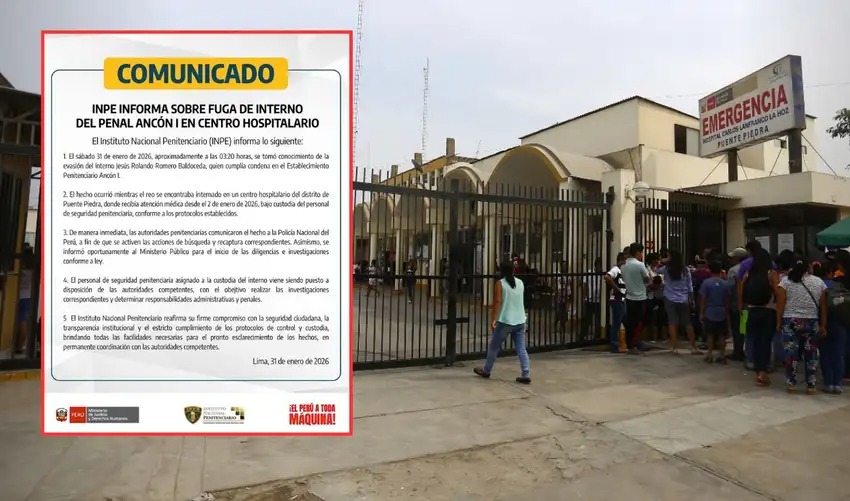 A través de un comunicado oficial, el INPE confirmó la evasión y señaló que su personal de seguridad fue puesto a disposición de las autoridades competentes, al tiempo que coordina con la Policía Nacional las labores de búsqueda y recaptura del interno.
