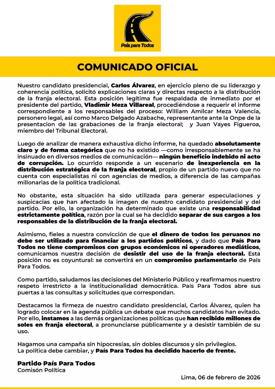 El partido País para Todos anunció que desistirá del uso de la franja electoral en la campaña presidencial de Carlos Álvarez. Mediante un comunicado, informó que tras una evaluación interna no se hallaron actos de corrupción, pero se determinó una responsabilidad política, por lo que separó a los responsables de la distribución del presupuesto. La organización sostuvo que el dinero público no debe financiar a los partidos y señaló que esta decisión se convertirá en un compromiso parlamentario. Asimismo, expresó su respeto a la institucionalidad y saludó las acciones del Ministerio Público.