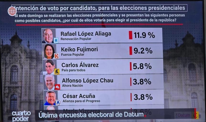 Rafael López Aliaga, de Renovación Popular, lidera la intención de voto con 11,9%, según la encuesta de Datum. En segundo lugar se ubica Keiko Fujimori, de Fuerza Popular, con 9,2%, seguida por Carlos Álvarez, de País para Todos, con 5,8%.