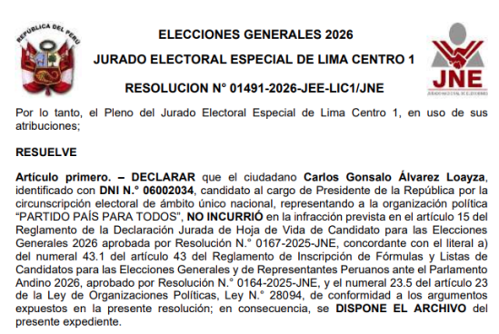 “No existe mérito para iniciar un procedimiento sancionador contra el ciudadano Carlos Gonsalo Álvarez Loayza, candidato al cargo de Presidente de la República en representación de la organización política Partido País para Todos, ello conforme a los considerandos precedentes de la presente resolución”, se lee en el argumento de la resolución del JEE.