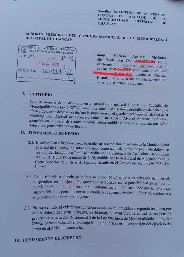 La ciudadana Judith Apolinar ha presentado formalmente un petitorio ante el Concejo Municipal para solicitar la suspensión en el cargo del alcalde del distrito de Chancay, Dr. Juan Alberto Álvarez Andrade.