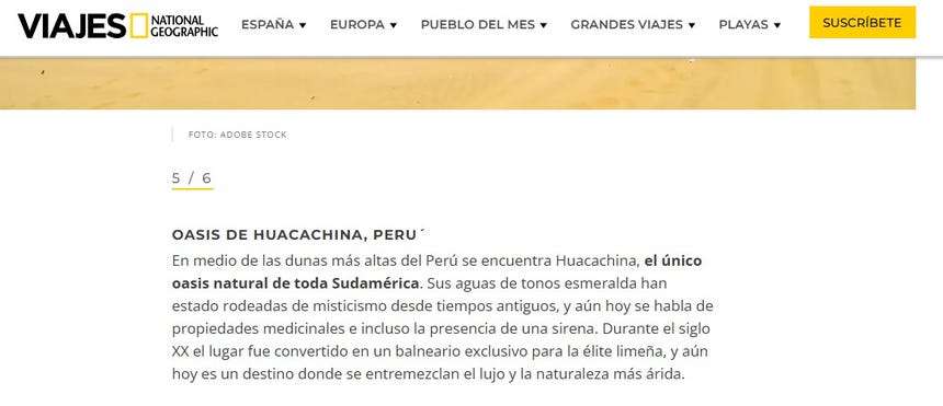 En el artículo escrito por la periodista Julia Cuesta del Hoyo se califica a los oasis, como la Huacachina, como «rincones donde el agua ha abierto paso a lugares fascinantes».