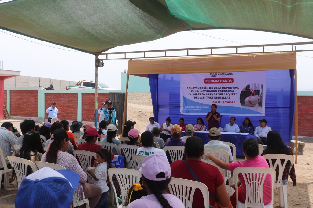 Con un emotivo y entusiasta recibimiento, la comunidad educativa de la institución “Humberto Arenas Velásquez”, ubicada en el asentamiento humano Tres Estrellas, participó en la ceremonia de colocación de la primera piedra de la obra “Construcción de losa deportiva”. Alumnos, docentes, padres de familia y vecinos dieron la bienvenida a las autoridades municipales, encabezadas por el alcalde distrital.