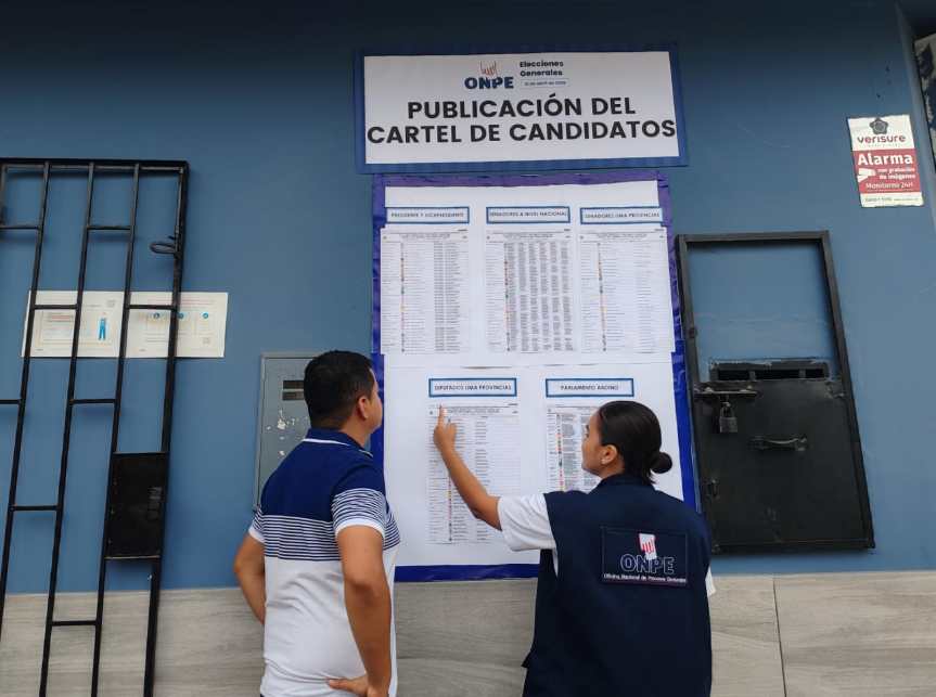 De acuerdo con los artículos 169 y 209 de la Ley Orgánica de Elecciones, la Oficina Nacional de Procesos Electorales debe difundir el cartel de candidatos en lugares públicos con una anticipación de 15 días previos a la fecha del proceso electoral, programado para el 12 de abril.