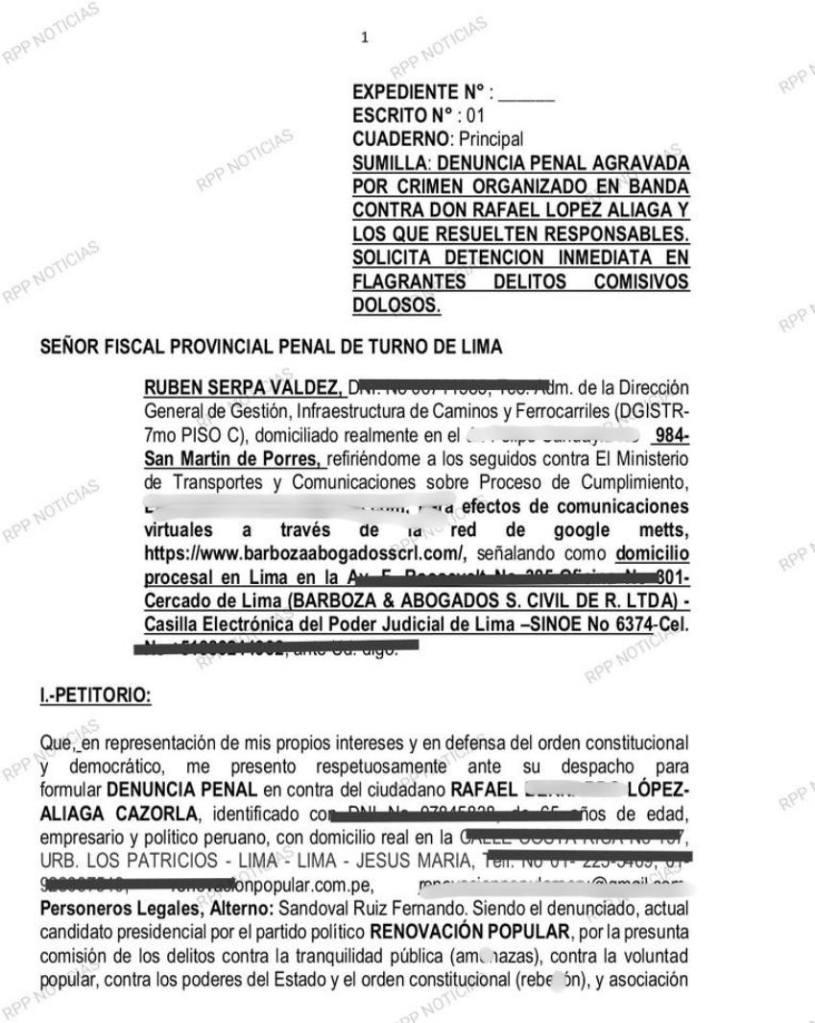 El ciudadano Rubén Serpa Valdez, presentó una denuncia penal agravada por crimen organizado en banda, contra Rafael Bernardo López Aliaga Cazorla, por la presunta comisión de los delitos contra la tranquilidad pública (amenazas), contra la voluntad popular, contra los poderes del Estado y el orden constitucional (rebelión), así como por asociación ilícita para delinquir en su modalidad de organización criminal.