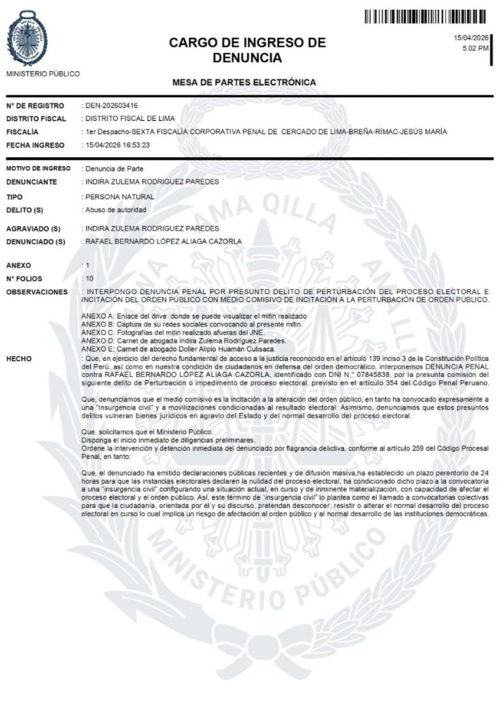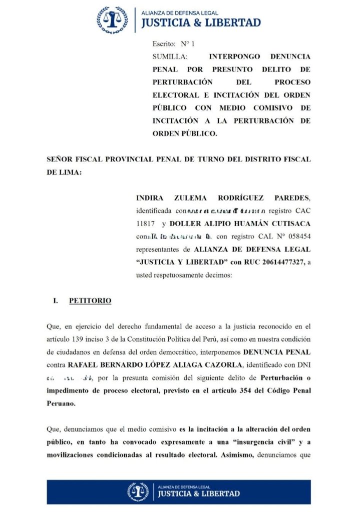 Hoy, también se conoció la denuncia penal presentada por la ciudadana Indira Rodríguez Paredes y do0ller Alipio Huamán Cutisaca, representantes de Alianza de Defensa Legal “Justicia y Libertad”, contra Rafael López Aliaga por la presunta comisión de los delitos de Perturbación o impedimento de proceso electoral, previsto en el artículo 354 del código penal peruano.