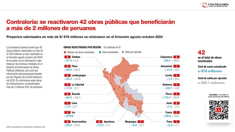 La Contraloría General reveló que 42 obras públicas valorizadas en más de S/ 878 millones se han reactivado en el trimestre agosto-octubre del 2024, de acuerdo con la información registrada por las mismas entidades en el Sistema de Información de Obras Públicas (Infobras), así como por información proporcionada por los Órganos de Control Institucional (OCI). De culminarse estas obras de infraestructura se beneficiará a más de 2 millones 232 mil peruanos.