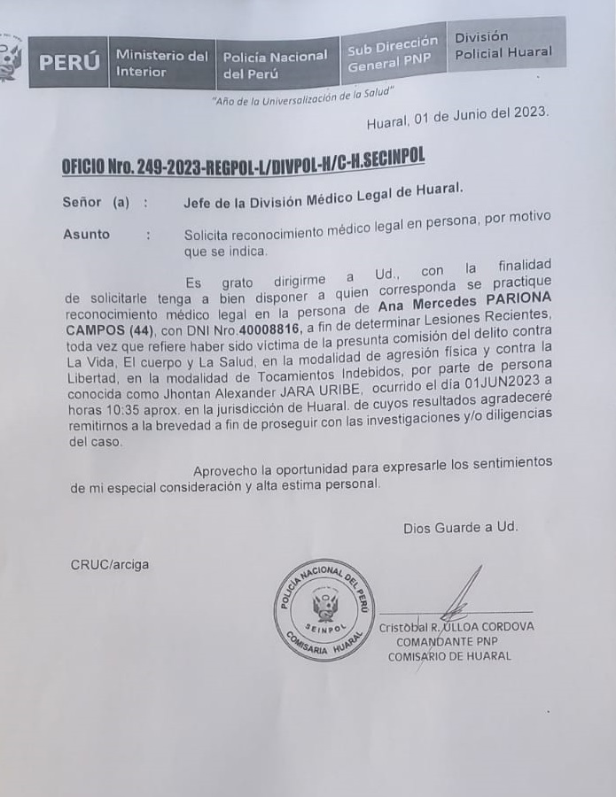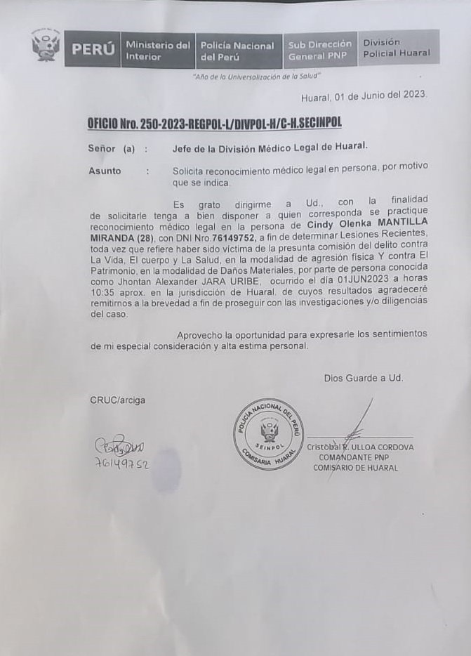 “Tuve una discusión con mi entonces pareja Jean Deza Sánchez, por lo cual decidí retirarme de la reunión. Al dirigirme a la habitación para sacar mi cartera, él sube y empieza a agredirme hasta perder el conocimiento y quedando inconsciente por horas”, se lee en el documento.