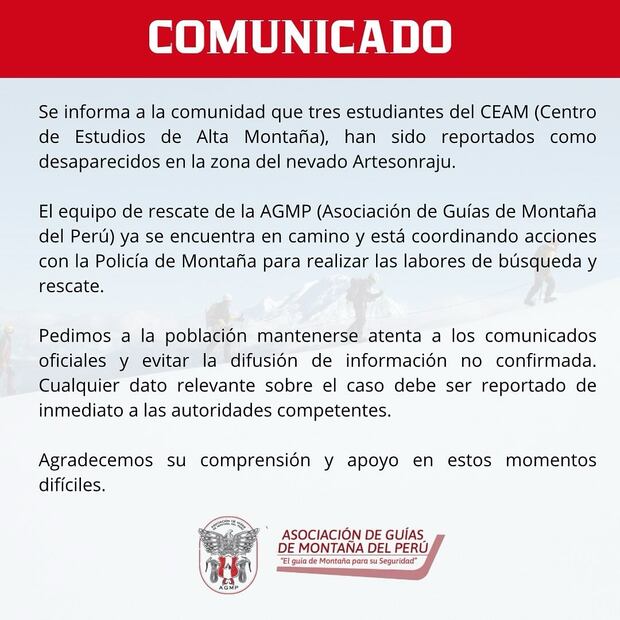 Ante la emergencia, la Asociación de Guías de Montaña del Perú (AGMP) ha desplazado un equipo de rescate a la zona y coordina acciones con la Policía de Montaña para localizar a los jóvenes.