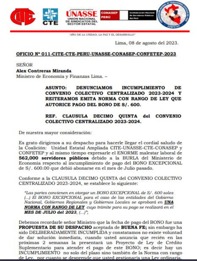 El Convenio Colectivo Centralizado 2025‑2026, suscrito el 30 de junio de 2025 entre el Estado peruano, en representación del empleador, y diversas centrales sindicales, establece importantes medidas económicas para el sector público. Destacan un aumento salarial permanente y un bono excepcional de S/ 100, además de otras mejoras como la incorporación de beneficios transitorios, el pase hacia el Monto Único Consolidado (MUC), y la implementación de la Compensación por Tiempo de Servicios (CTS) para trabajadores bajo el régimen CAS (DL 1057).