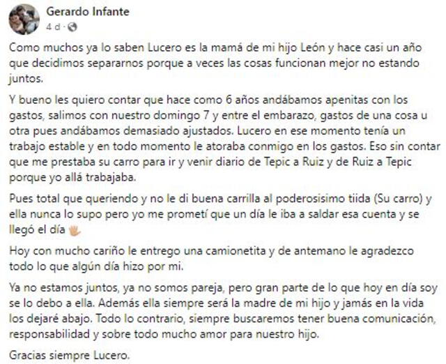 «Como muchos ya saben, Lucero es la mamá de mi hijo León y hace casi un año que decidimos separarnos porque a veces las cosas funcionan mejor no estando juntos. Y bueno, les quiero contar que hace como seis años andábamos apenitas con los gastos, salimos con nuestro domingo siete y entre el embarazo, gastos de una cosa y otra, pues andábamos demasiado ajustados», contó Gerardo.