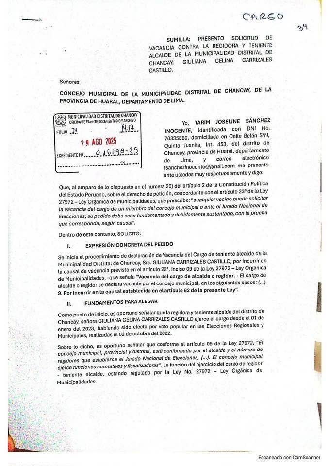 Esta humilde mujer, ahora curiosamente aparece como la solicitante de la vacancia de la regidora Giuliana Carrizales, quien no tendría la capacidad para redactar un escrito y mucho menos para pagar la asesoría de un abogado, por lo que se presume que la referida Joselyn estaría siendo utilizada, por los verdaderos autores de esta vacancia y que tendrían la intención de sacar del camino a la regidora chancayana Giuliana Carrizales.