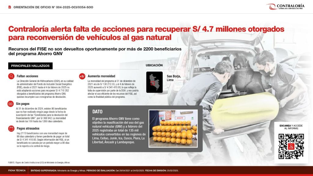 La Contraloría General de la República alertó al Ministerio de Energía y Minas (MINEM) que la Dirección General de Hidrocarburos (DGH), en su calidad de administrador del Fondo de Inclusión Social Energético (FISE), desde el 2021 hasta el 4 de febrero de 2025 no está adoptando las acciones que correspondan para recuperar la suma de S/ 4 710 352 que fueron otorgados a los beneficiarios del programa Ahorro GNV, quienes no están cumpliendo con el pago de las cuotas establecidas en sus respectivos cronogramas de devolución.