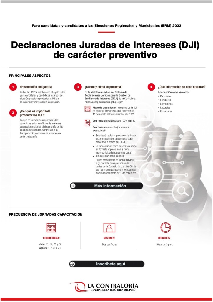 Hasta el viernes 2 de setiembre del presente año, las candidatas y candidatos a las Elecciones Regionales y Municipales (ERM) 2022 tienen plazo para presentar sus Declaraciones Juradas de Intereses (DJI) de carácter preventiva a la Contraloría General de la República. A la fecha, más de 3300 postulantes han registrado sus declaraciones, y en consecuencia han cumplido con lo establecido en la Ley N° 31227.