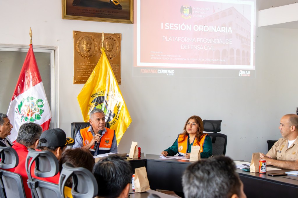 La sesión fue liderada por el alcalde provincial Fernando Cárdenas Sánchez, en su calidad de presidente de la Plataforma de Defensa Civil. Durante la reunión, la Ing. Cecilia Jannet Martino Salcedo, subgerente de Gestión del Riesgo de Desastres y secretaria técnica de la plataforma, presentó las acciones prioritarias del Plan de Trabajo 2025, enfocado en fortalecer la prevención y respuesta ante emergencias en la provincia.