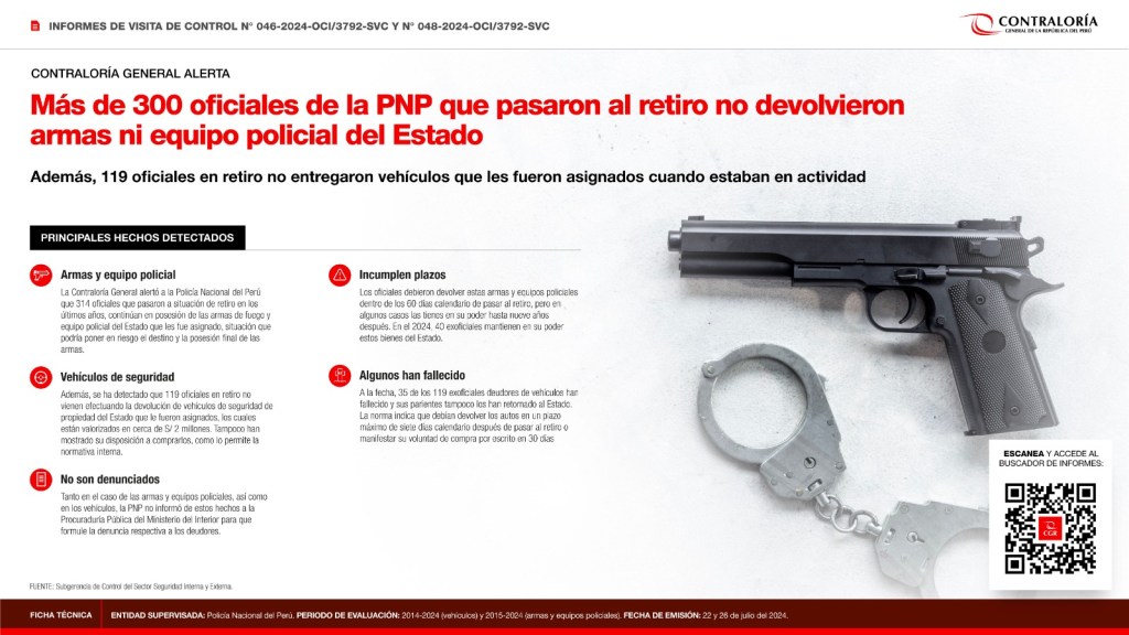 La Contraloría General alertó a la Policía Nacional del Perú (PNP) que 314 oficiales que pasaron a la situación de retiro en los últimos años continúan en posesión de las armas de fuego y equipo policial del Estado que les fue asignado para cumplir con el servicio policial, seguridad y defensa personal durante el periodo 2015-2024, situación que pondría en riesgo el destino y la posesión final de estos por no cumplir con la devolución en los plazos establecidos.