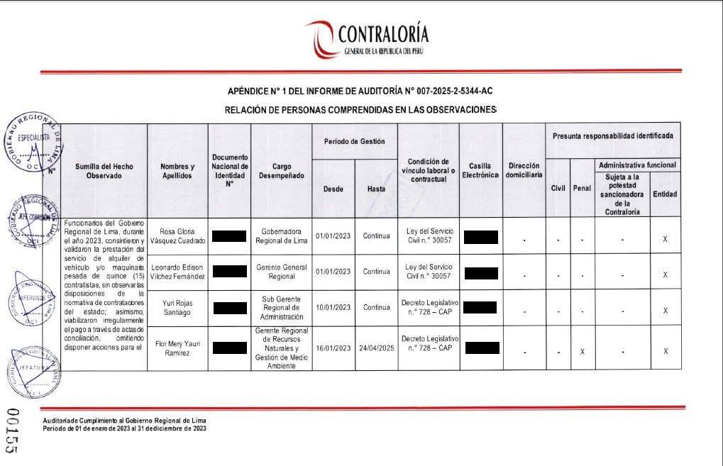Según Contraloría, en el marco del Estado de Emergencia declarado mediante Decretos Supremos N° 029 y 035- 2023-PCIV del 03 y 12 de marzo del 2023, respectivamente, funcionarios del Gobierno Regional de Lima, conformado por el titular de la Entidad (Gobernadora Regional de Lima), el área usuaria (Gerencia Regional de Recursos Naturales y Gestión de Medio Ambiente y Oficina Regional de Defensa Civil y Defensa Nacional) y el Órgano Encargado de las Contrataciones (Subgerencia Regional de Administración y Oficina de Logística), así como la máxima autoridad administrativa de la Entidad (Gerencia General Regional), consintieron y validaron la prestación del servicio de alquiler de vehículos y/o maquinaria pesada de 15 contratistas, sin observar lo establecido en la normativa de contrataciones del Estado y/o normativa interna de la Entidad.
