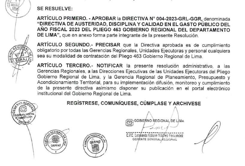 Sin embargo la directiva N° 004-2023-GRL-GGR., firmada por el Gerente General del Gobierno Regional Lima, Leonardo Edison Vílchez Fernández, señala que: