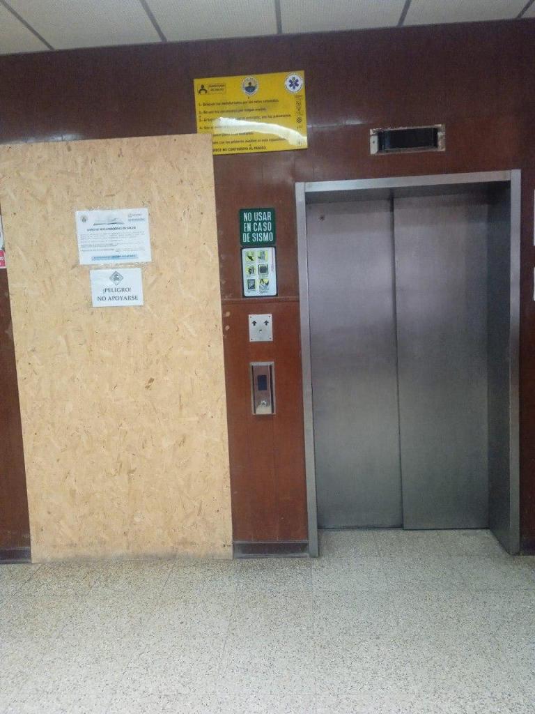 La inspección constató que los dos ascensores para camillas están fuera de servicio. Uno, inoperativo desde 2015, permanece clausurado con una plancha de madera en su entrada y el otro está pendiente de reparación bajo garantía. Además, un montacargas, cuya función es transportar material limpio y esterilizado, era utilizado de manera irregular para el traslado de personas y en la actualidad tampoco está operativo.